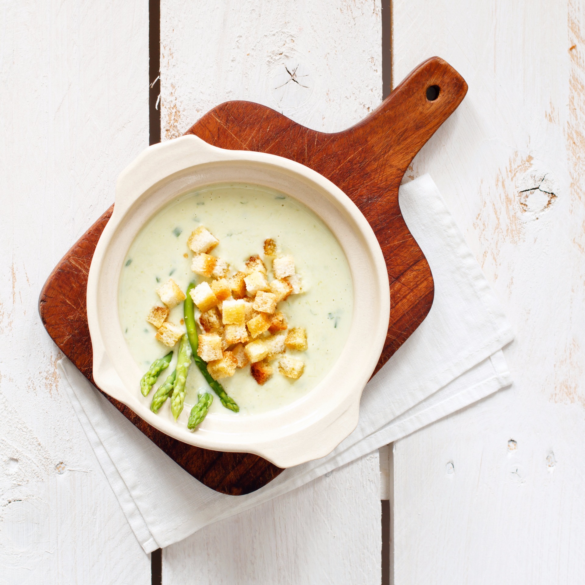 Denne lækre cremede suppe er perfekt som en forårs- og sommermåltid og så er den super nem at lave. Du har kun brug for et par basis-ingredienser og nogle friske asparges. Husk altid at købe lokalt for at støtte de lokale landmænd. Pynt retten af med brødterninger, friske krydderurter eller en skefuld creme-fraiché og forkæl dig selv.